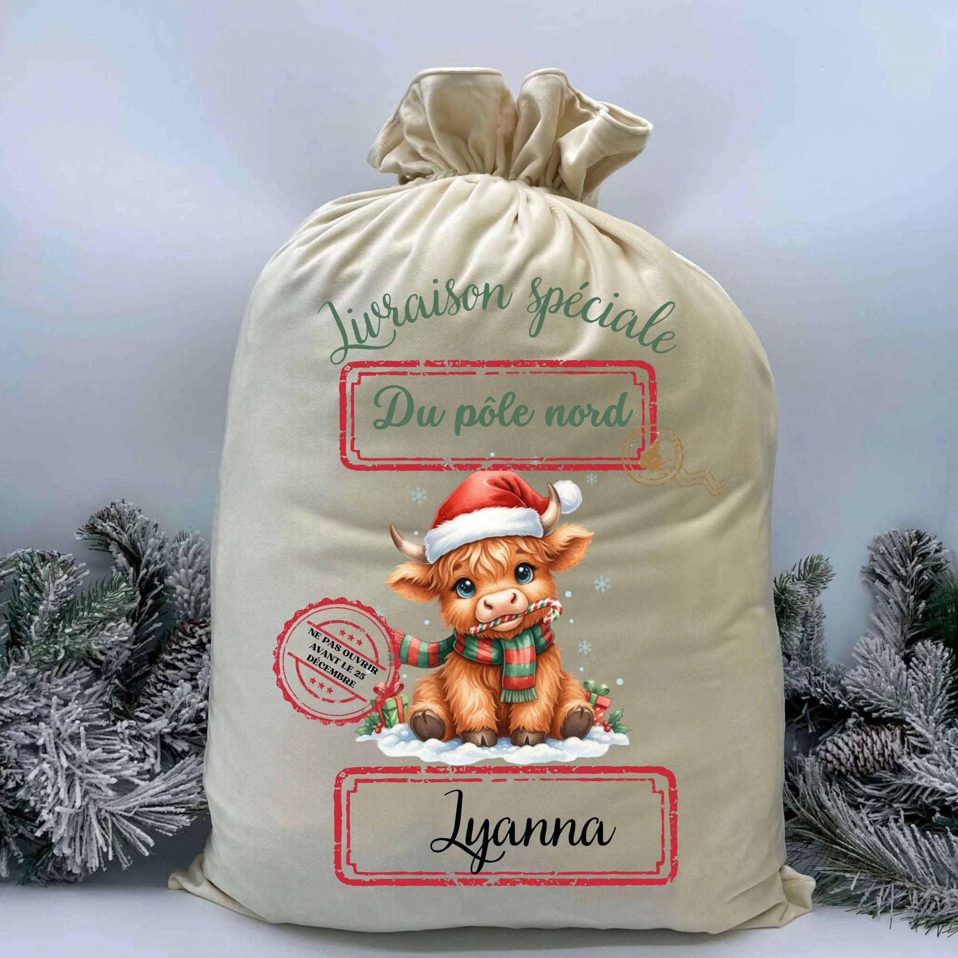 Poche à cadeaux en velour vache higland *personnalisable*